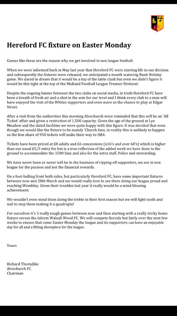 Alvechurch chairman Richard Thorndike has issued the following statement: