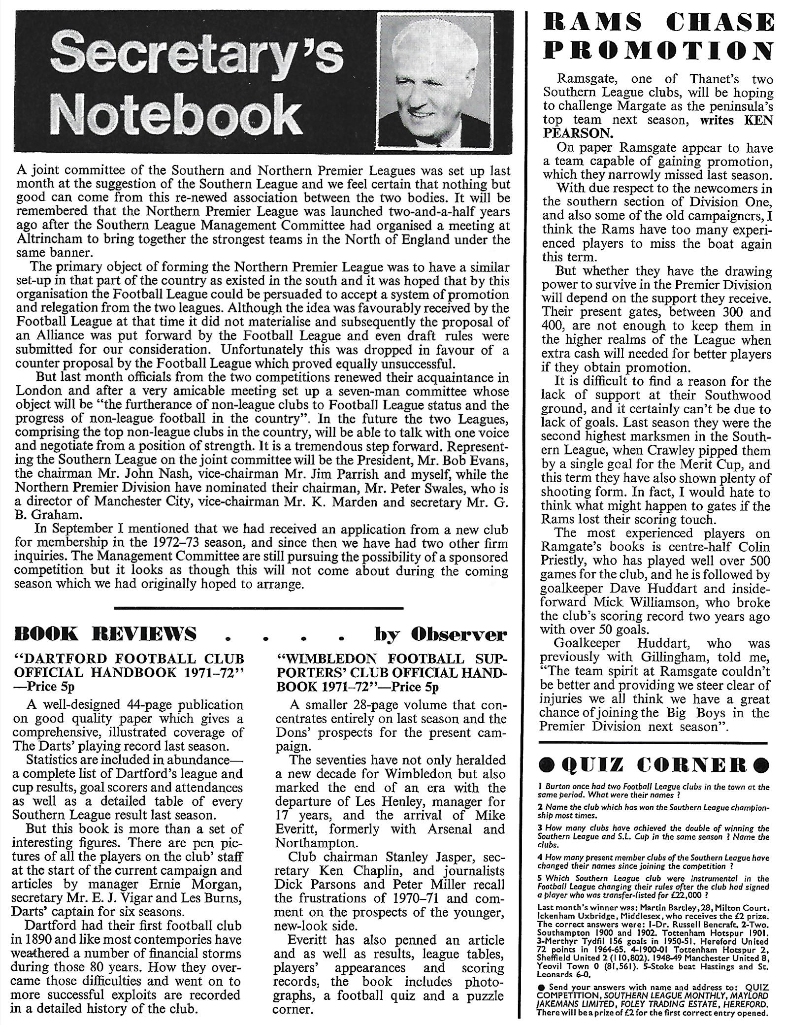 Page 2: Hereford are revealed as one of the previous edition's quiz answers, the question was: "who collected the most points in a Southern League Season?" HUFC: 72 points, 1964-65. Hereford topped Division 1, getting 72 points courtesy of an impressive 34 wins, with only 4 draws and 4 defeats. In 3 points for a win money, that would be a whopping 106 points - in only 42 matches.