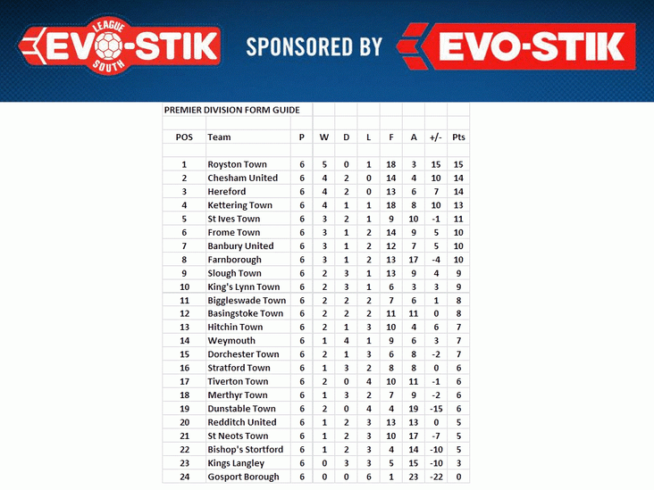 Royston Town top the Southern Premier form guide after winning five of their last six games. Hereford lie third, having dropped points against Merthyr and Slough.